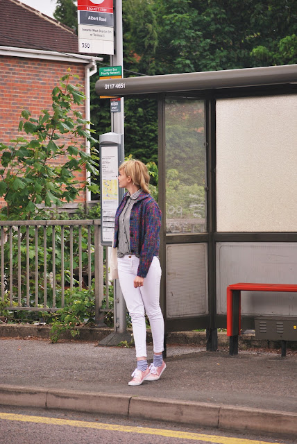 Vintage shirt and rainbow tweed jacket, Zara trousers, H&M socks and sneakers.
